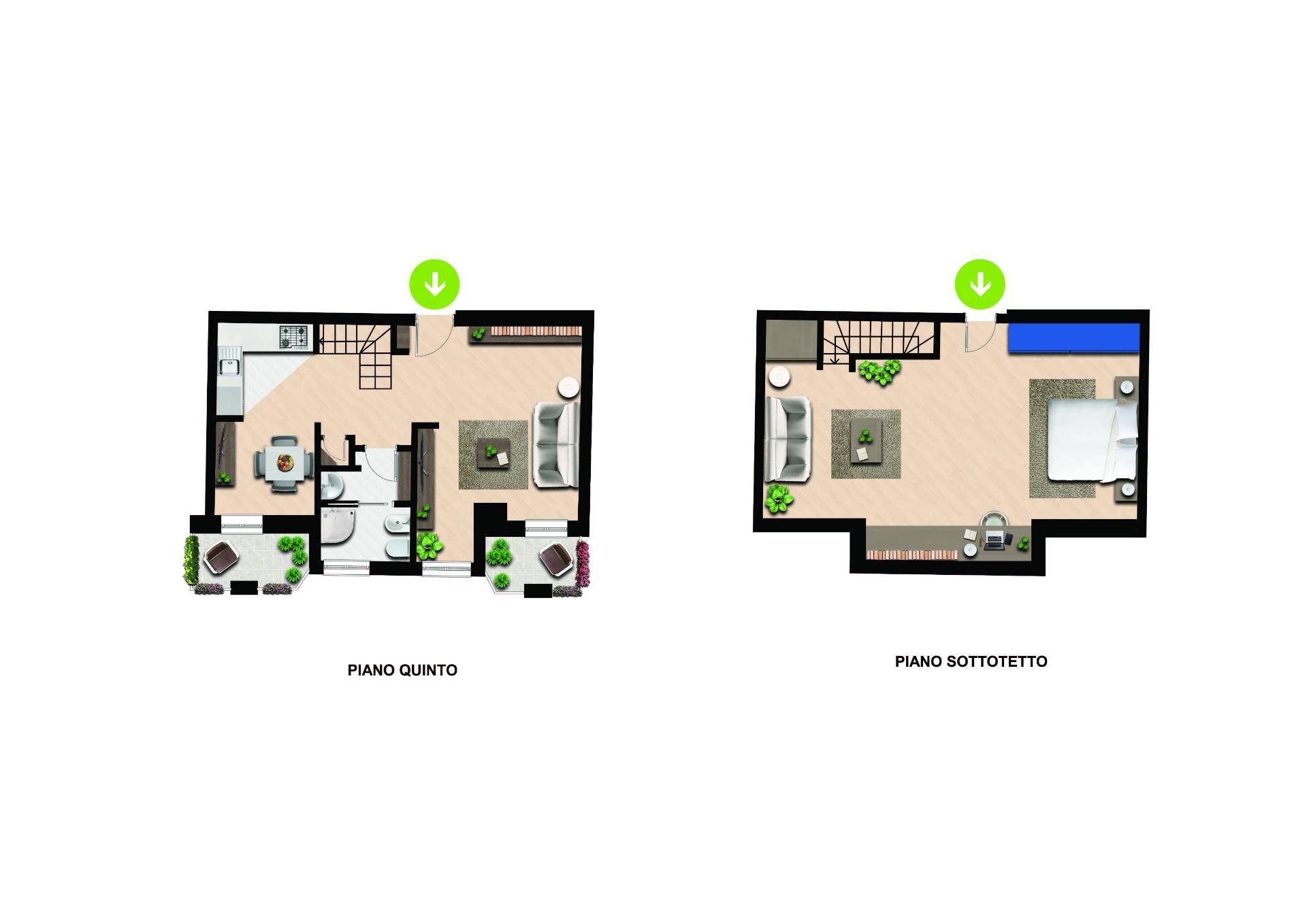 Il piano è arricchito da lucernari che garantiscono un'ottima illuminazione naturale e un'atmosfera calda e riservata.