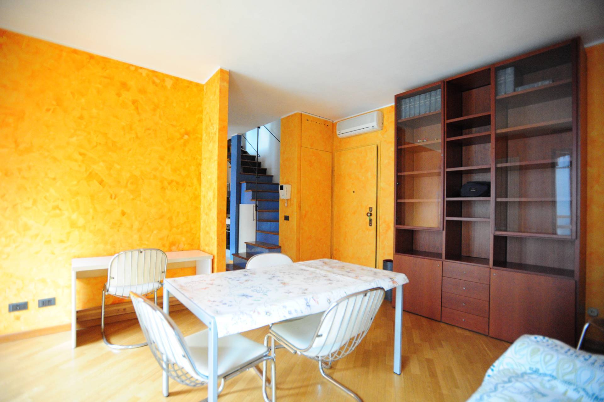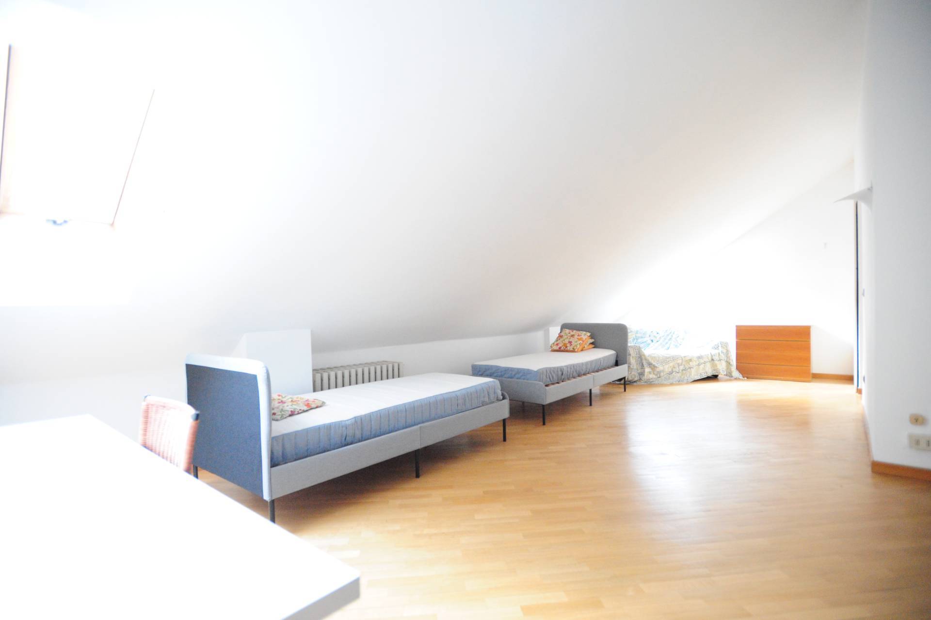 Una scala interna in legno conduce al piano superiore, mansardato ma perfettamente vivibile, dove attualmente si trova un ampio open space con la possibilità di realizzare 2 camere e servizio. Inoltre è dotato di secondo ingresso indipendente dal vano scale condominiale che offre una pratica soluzione per eventuale uso studio, camera per ospiti o locazione parziale.