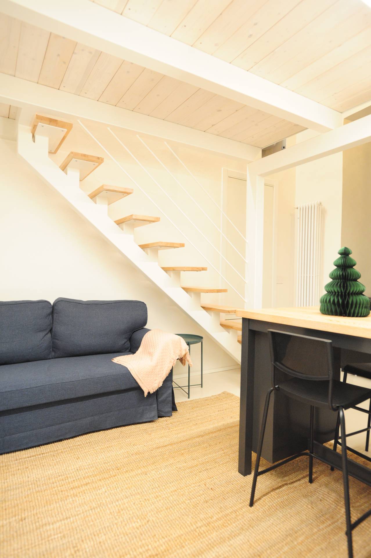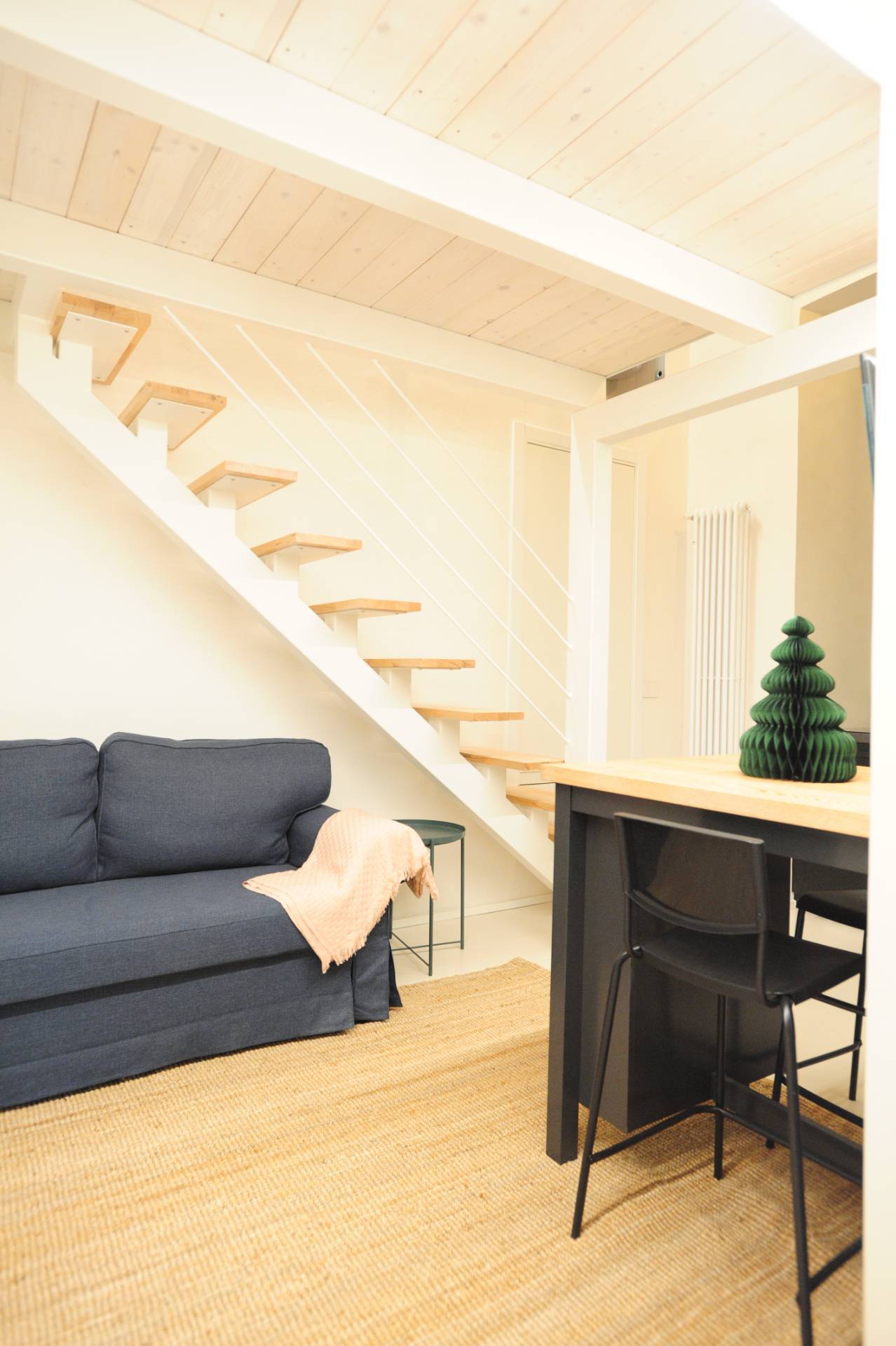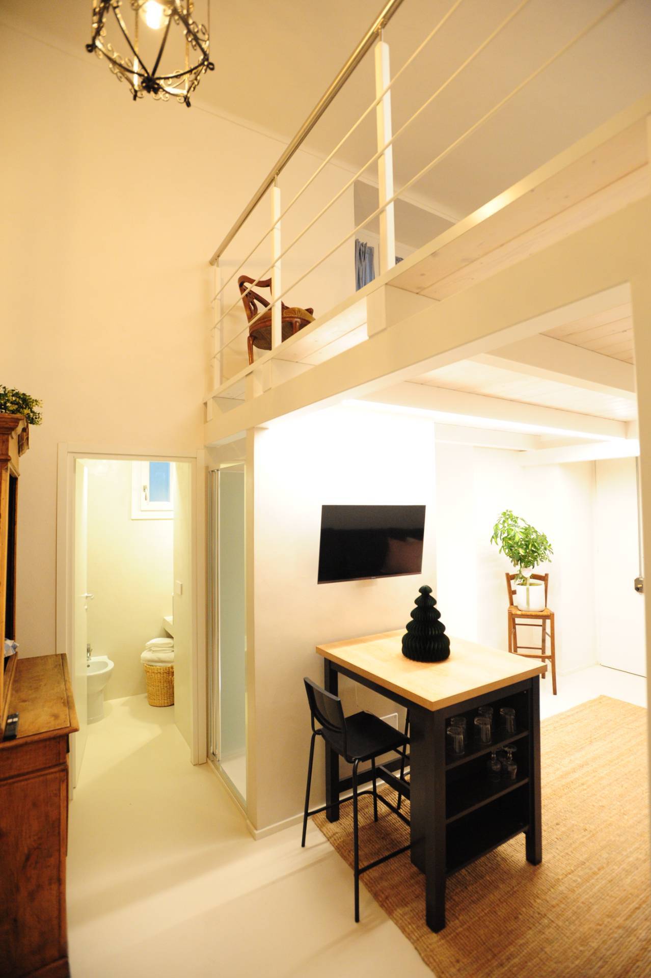 Gli ambienti sono distribuiti su due livelli con due graziosi balconcini e consentono una comoda divisione zona giorno/zona notte: l'ingresso è direttamente su zona soggiorno con cucina a vista nella quale è presente un divano letto e servizio. Il piano soppalco è un luminoso ambiente aperto sul soggiorno adibito a camera letto matrimoniale. Gli ambienti sono di nuova realizzazione con impiego delle ultime tecnologie disponibili, totalmente arredati pronti da vivere e dotati di tutti i comfort: wifi in fibra ottica, gestione indipendente di temperatura, lavanderia in zona comune, climatizzatore, smart tv full hd