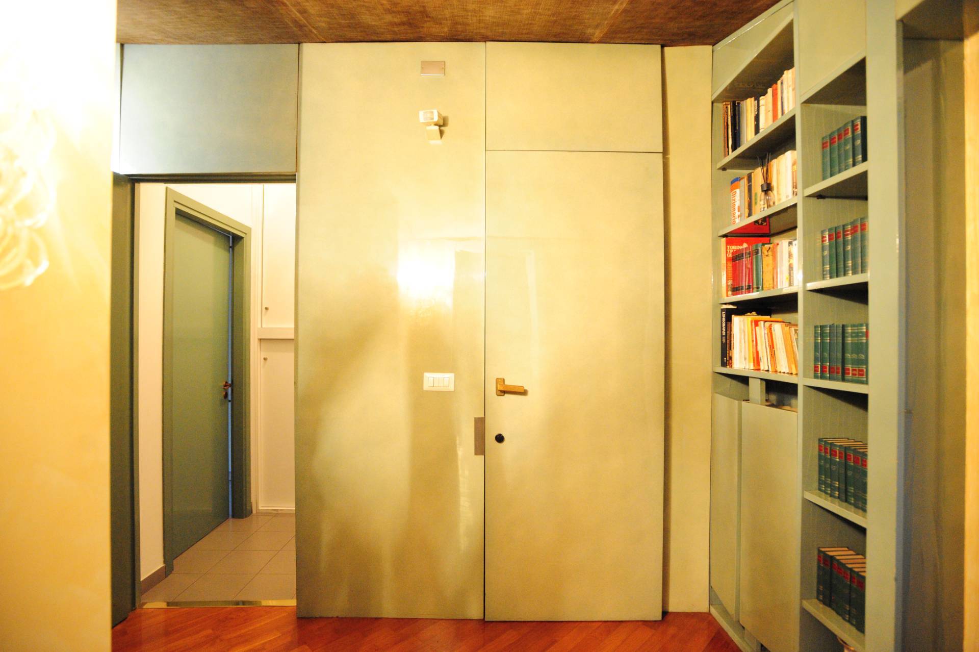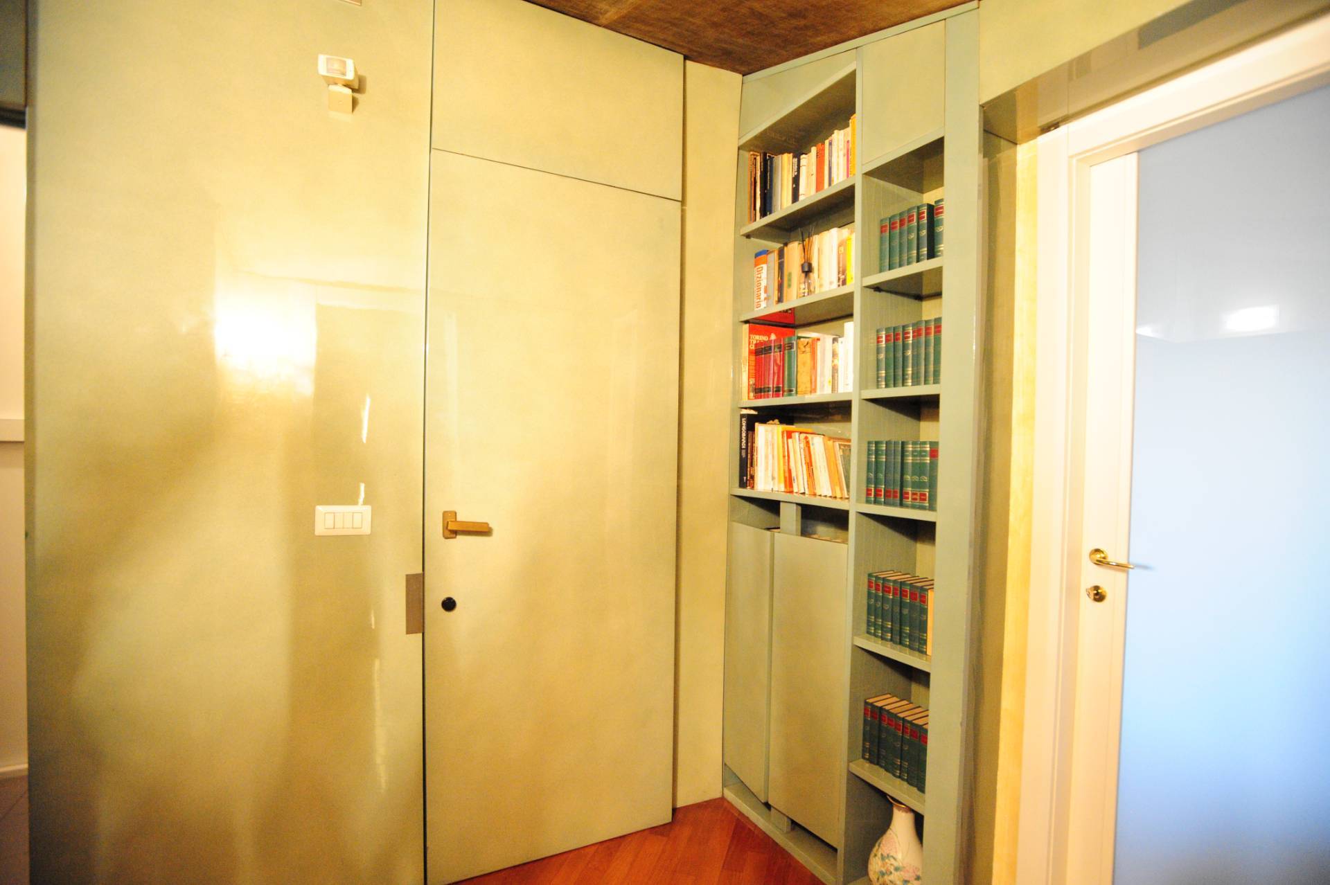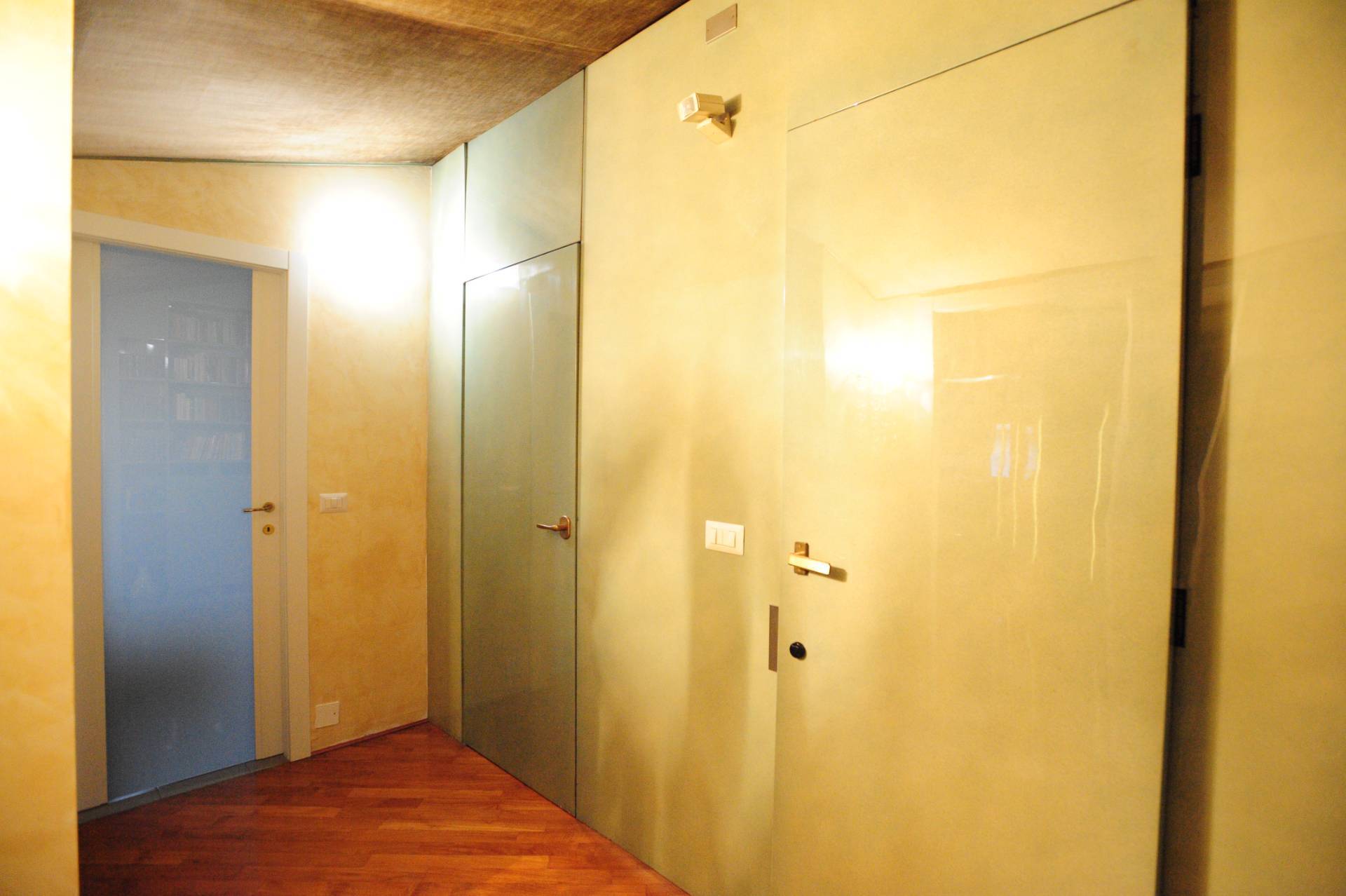 Doppi ingressi, con il principale aperto sull'ampia zona giorno openspace, caratterizzata da un affascinante dislivello che definisce due aree distinte. Il soffitto particolare, rivestito con velluto teso aggiunge un tocco di design contemporaneo.